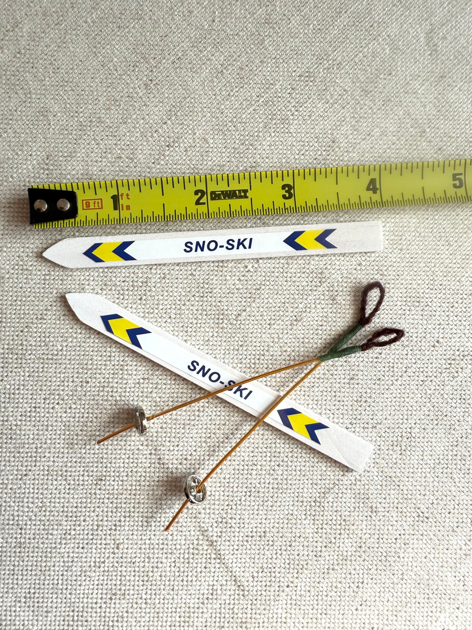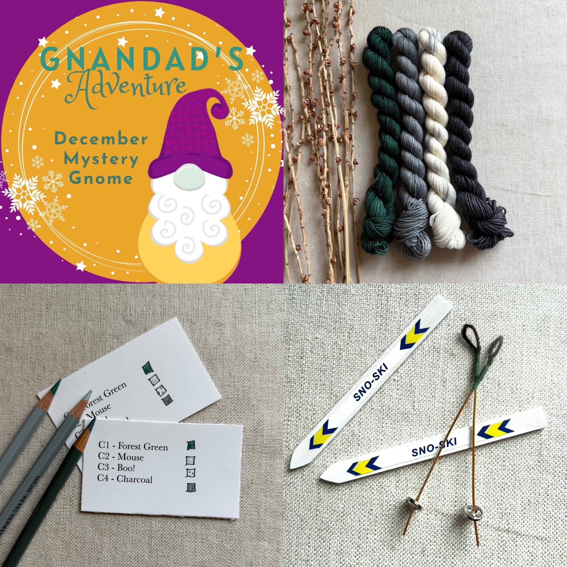 This gnome kit includes 4 mini skeins, a gnome sticker, a color card & 2 - popsicle sticks that you can paint and/or decorate for skis. I do have a skis & poles set, which are sold separately. Just follow the link below: