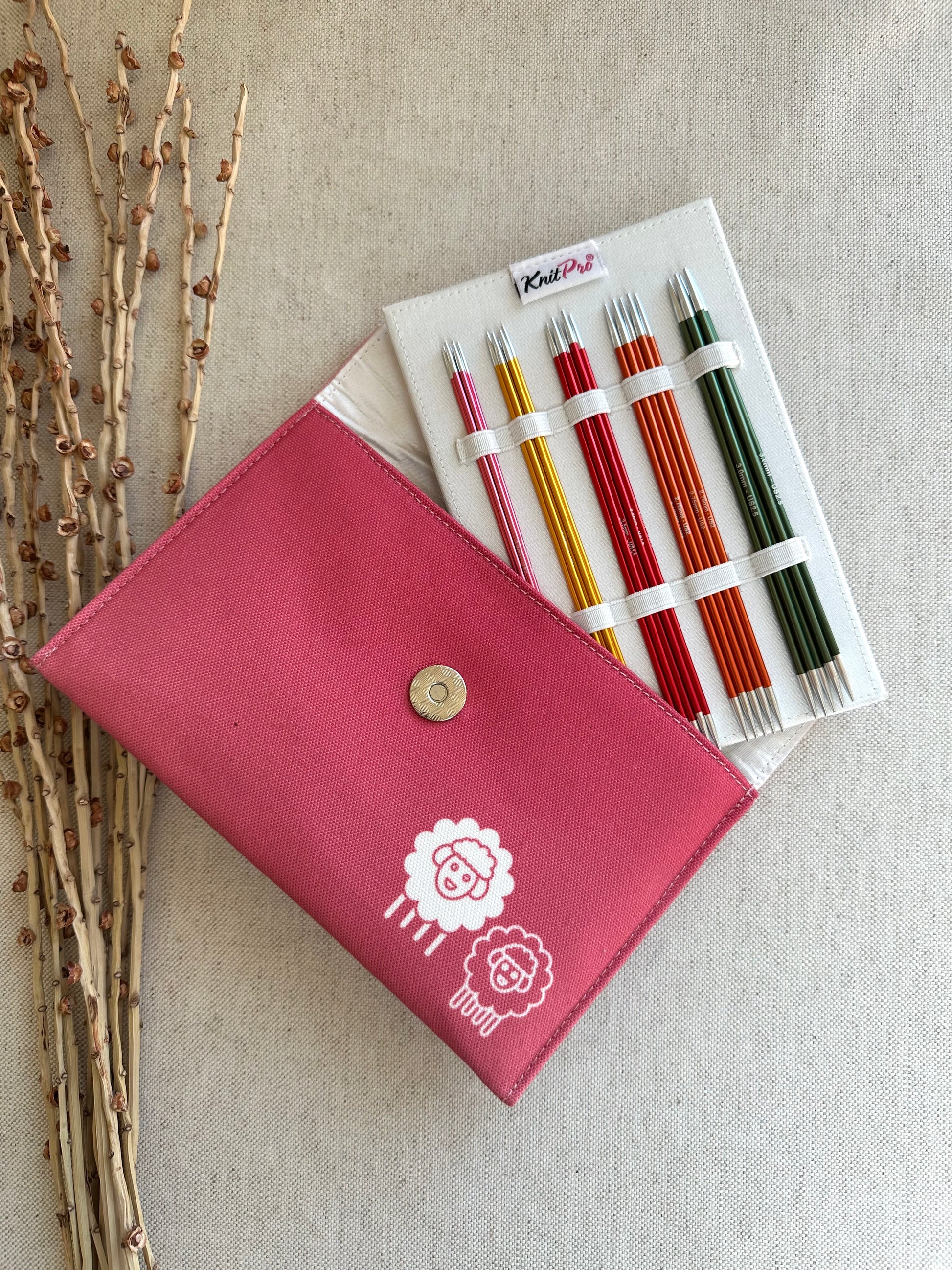 - Packaging: Each set of 5 (per size) double-pointed knitting needles is securely stored and packaged in a pretty envelope-style pink fabric case.