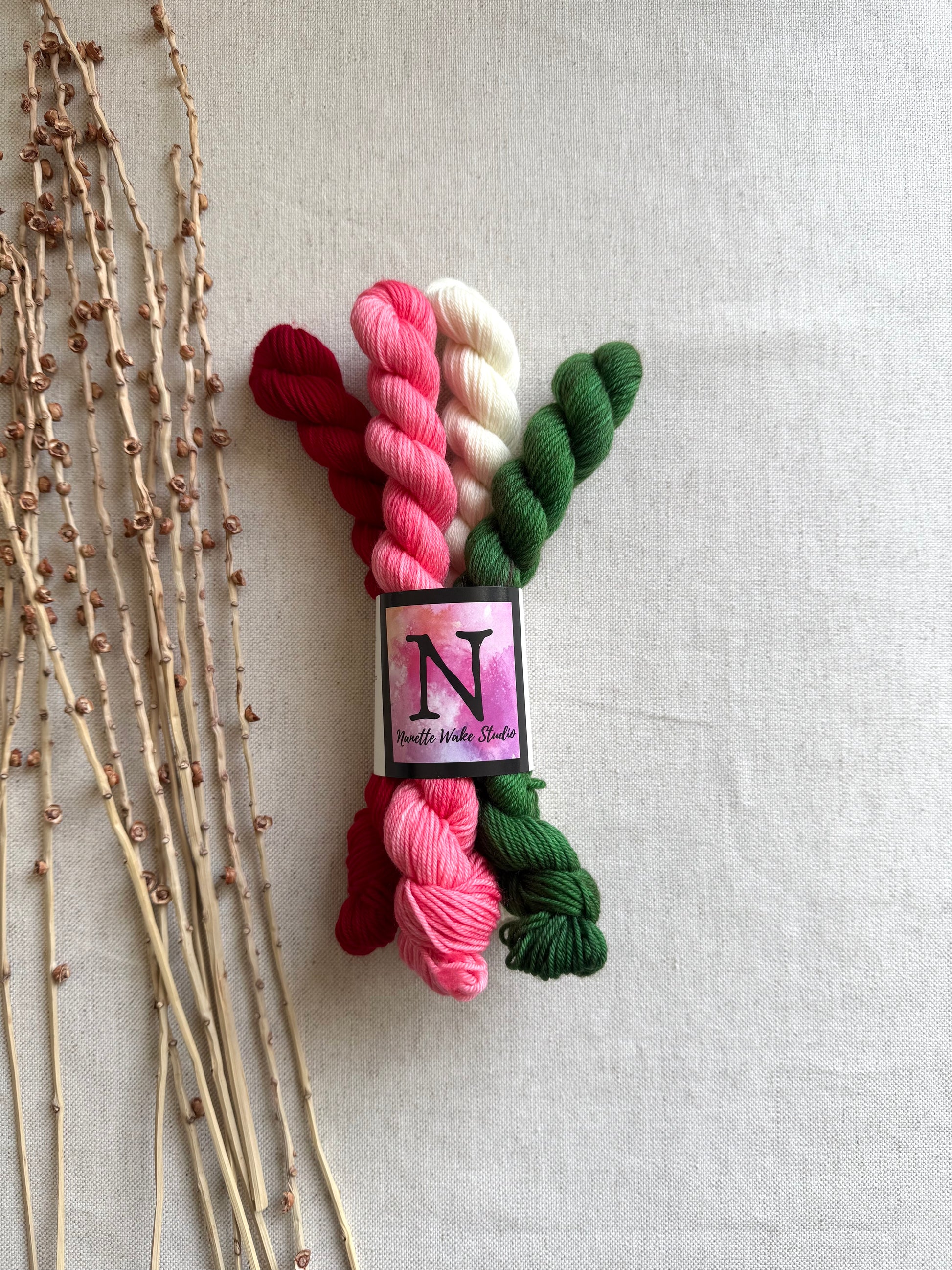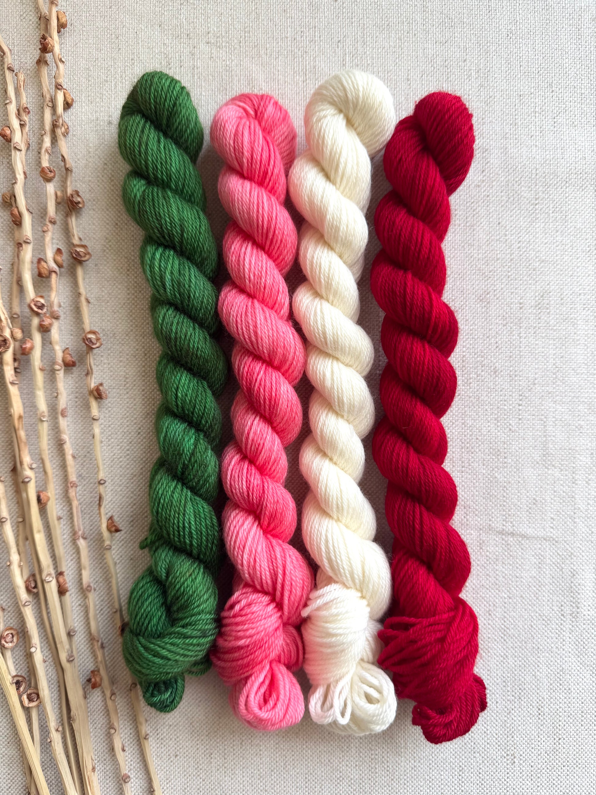 These mini skeins are 87 yards of super soft superwash merino nylon in speckled colors. As with most of my hand dyed yarn, they're one of a kind and not necessarily repeatable. They're the perfect about of yarn for knitting scrappy projects, gnomes, and other stuffed creatures.