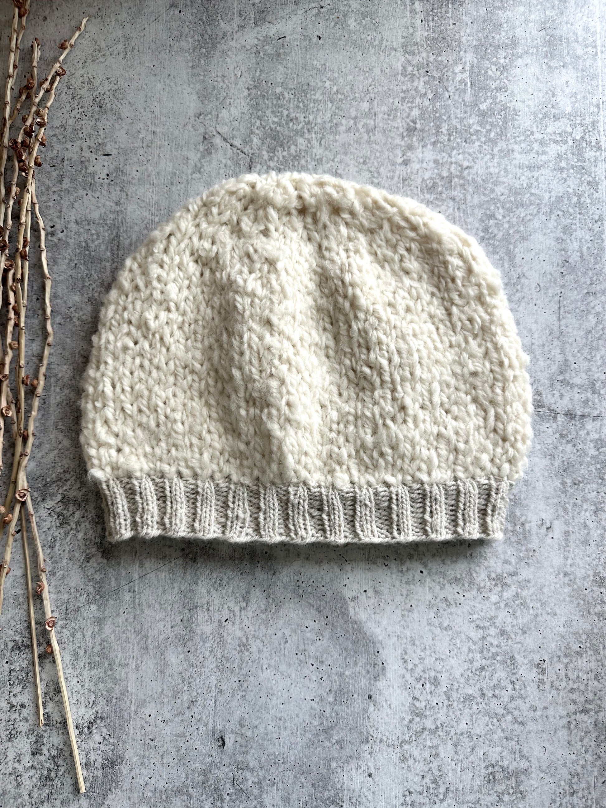The Textured Toros Hat has a ribbed brim that’s knitted with DK yarn and a crown that knit with a super bulky, textured yarn. I’ve included 3 different sizes…small, medium & large (21”, 22’ 23”). The hat pattern is included in my Toros Hat Kits. Malabrigo Rasta may be substituted for the textured yarn.