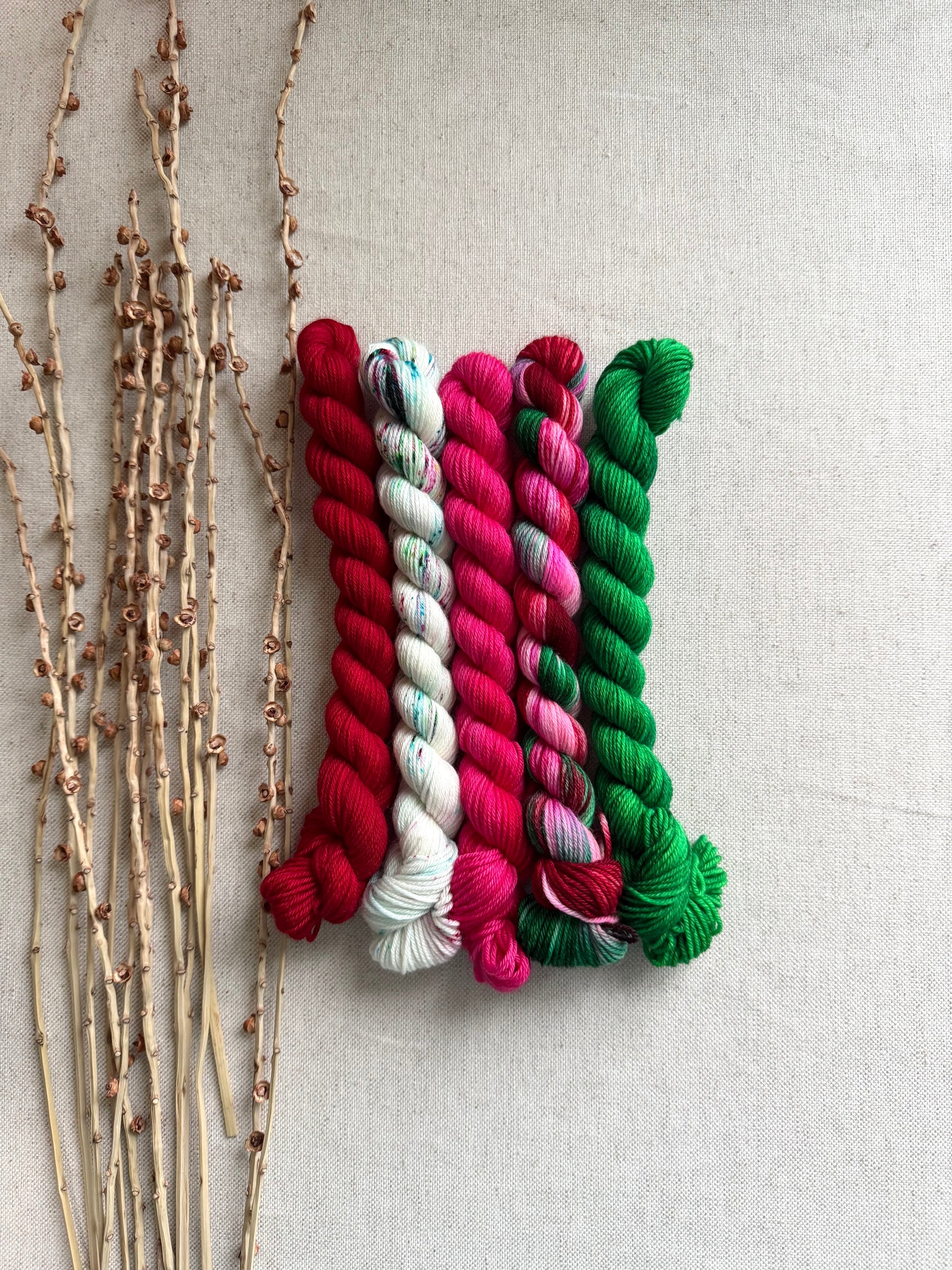 These mini skeins are 87 yards of super soft superwash merino nylon in speckled colors. As with most of my hand dyed yarn, they're one of a kind and not necessarily repeatable. They're the perfect about of yarn for knitting scrappy projects, gnomes, and other stuffed creatures.